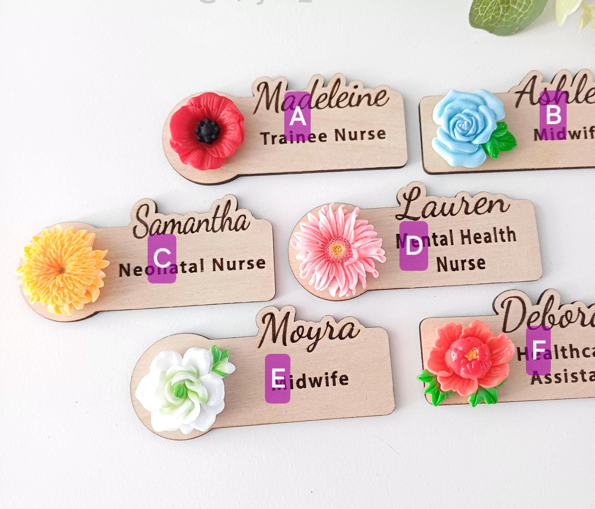 Badge are carefully handmade from high-quality wood and pretty Daisy flower Each piece is crafted with precision and a passion for quality. Personalize your badge of your choice. It's the ideal way to stand out in the workplace These 3D Badge perfect treat for yourself or makes an excellent thoughtful present for anyone who uses a badge regularly professionals, teachers, Event staff, Midwife, Pharmacist , healthcare ,retail, education, healthcare or office. Ideal for everyday useChoose option - Flower colour option -Magnet or Safety Pin Each badge is made to order with care Wooden Badge measure ( 7.5mm x 30mm)Made to order processing time on your order are 3-5 daysProcessing & Shipping: Please allow 3-5 days for customization.* UK Royal Mail 1st class postage & Packaging * International shipping Available, If purchasing outside of the UK International Tracked 7-10 working days Please be aware that items may take a little longer to arrive depending on customs and postal service in your country. Please allow 7-10 weeks depending upon location.Don’t forget to check out our store for more personalized accessories and thoughtful gift ideas!Thank you so much for browsing. Happy Shopping